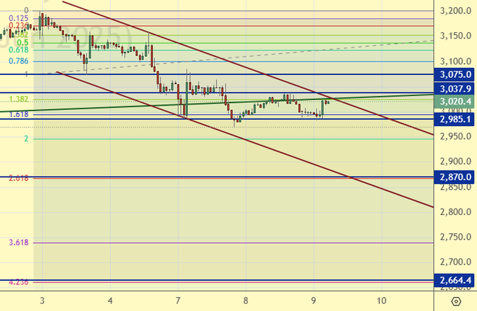 Продажа: нет. Кто в позиции от 3034, держите стоп на 3090. Цель: 2870.