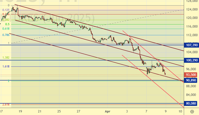 Продажа: при касании 92500. Стоп: 92800. Цель: 83000.