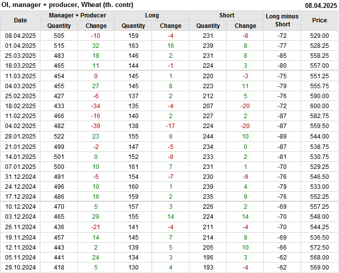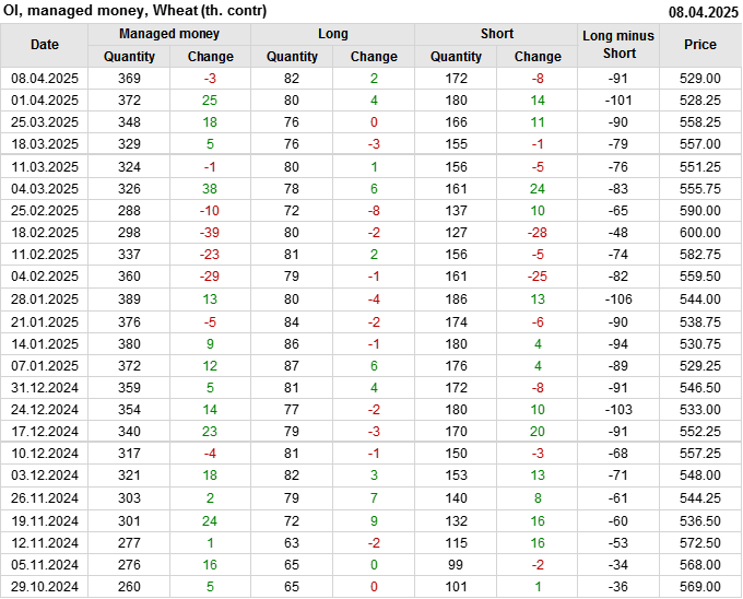 За прошедшую неделю, 02.04.25 — 08.04.25, разница между длинными и короткими позициями управляющих сократилась на 9.9 тыс. контрактов. В тоже время, цена выросла на 0.75 цента.