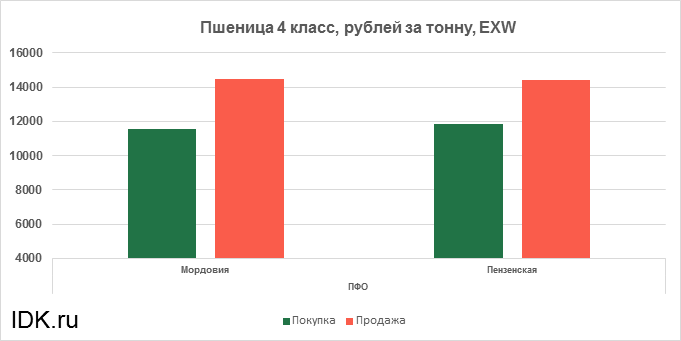 За прошедшую неделю с 07.04.2025 по 11.04.2025 средняя цена на пшеницу 4-го класса, согласно выставленным заявкам трейдеров, упала по всем округам на 105 рублей. Средняя цена составляет 13130 рублей за тонну.