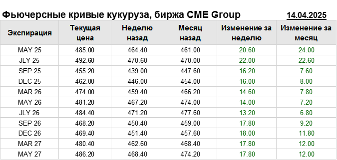 На 14.04.2025 стоимость кукурузы на бирже CME Group по контракту MAY 25 составила 485 центов за бушель. За прошедшую неделю стоимость кукурузы на площадке CME Group выросла на 20.6 цента/бушель. Как мы видим на графике, фьючерсная кривая имеет периоды, когда более дальний фьючерс дешевле ближнего. Состояние бэквардации наблюдаем на следующих контрактах: SEP 25; SEP 26; Таким образом, трейдеры предполагают, что возможно превалирование предложения над спросом в указанные периоды.