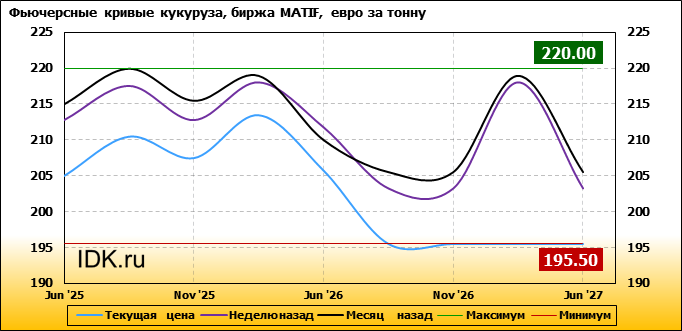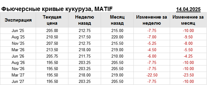 На 14.04.2025 стоимость кукурузы на бирже MATIF по контракту Jun ’25 составила 205 евро за тонну. За прошедшую неделю стоимость кукурузы на европейской площадке упала на 7.75 евро/тонна. Как мы видим на графике, фьючерсная кривая имеет периоды, когда более дальний фьючерс дешевле ближнего. Состояние бэквардации наблюдаем на следующих контрактах: Nov ’25; Jun ’26; Aug ’26. Таким образом, трейдеры предполагают, что возможно превалирование предложения над спросом в указанные периоды.