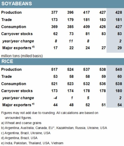 Прогноз по конечным запасам (совокупность соответствующих местных маркетинговых лет) повышен на 4 млн т м/м, до 580 млн, что остается самым низким показателем за последние десять лет. Торговля (июль/июнь) прогнозируется на 2 млн т выше, чем ранее, и составит 418 млн т, что связано в основном с более крупными, чем ожидалось, недавними потоками кукурузы, в том числе в страны Африки к югу от Сахары.