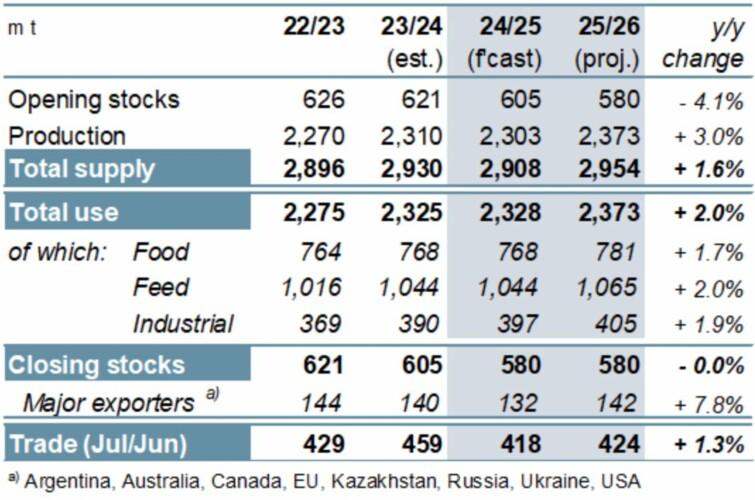 В основном благодаря ожиданиям богатого урожая кукурузы, производство зерновых прогнозируется на новом пике в 2025/26 году, что на 70 млн т выше, чем в прошлом году, и составит 2 373 млн т. Поскольку рост предложения в целом совпадает с ростом потребления, запасы на конец сезона не изменятся по сравнению с прошлым годом. Прогнозируется незначительное увеличение запасов фуражного зерна, в то время как запасы пшеницы могут сократиться третий год подряд. Ожидается, что объем торговли вырастет до 424 млн т, но будет меньше среднего на фоне приглушенного покупательского интереса со стороны Китая.