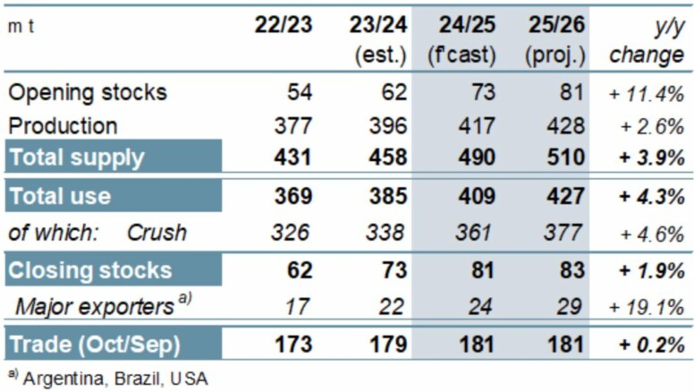 На фоне рекордных поставок мировое потребление и запасы соевых бобов в 2024/25 гг. достигнут соответствующих максимумов, а объем торговли увеличится до 181 млн т. Что касается перспектив на 2025/26 гг., то мировое производство прогнозируется на рекордном уровне (+3%), причем основную роль в росте сыграет увеличение урожая в Южной Америке. Прогнозируется дальнейший рост потребления за счет увеличения спроса на корма, продукты питания и промышленные товары, при этом запасы останутся на высоком уровне. Мировой импортный спрос, вероятно, останется стабильным, поскольку сокращение поставок в Китай компенсируется увеличением поставок на более мелкие рынки.