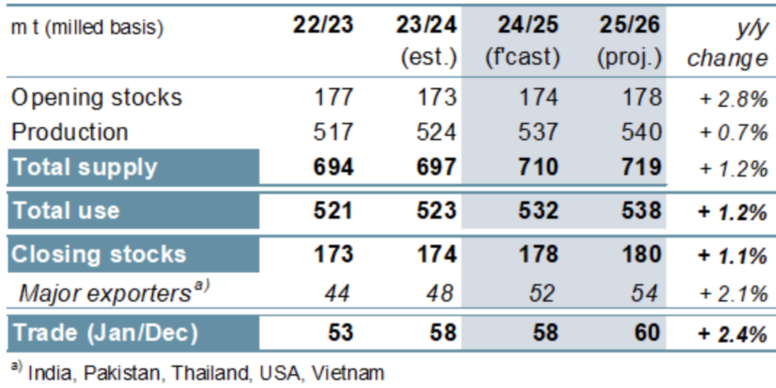 По прогнозам, в 2025/26 году мировое производство риса достигнет своего пика, в том числе благодаря более крупным урожаям в основных странах-экспортерах и Китае. Поскольку прирост населения будет способствовать рекордному потреблению, ожидается, что совокупные запасы будут расти. По предварительным прогнозам, мировой импортный спрос в 2026 году достигнет рекордных 60 млн т (+2%), что будет определяться потребностями африканских и азиатских покупателей, причем на долю индийских поставок придется около 40% всех поставок.