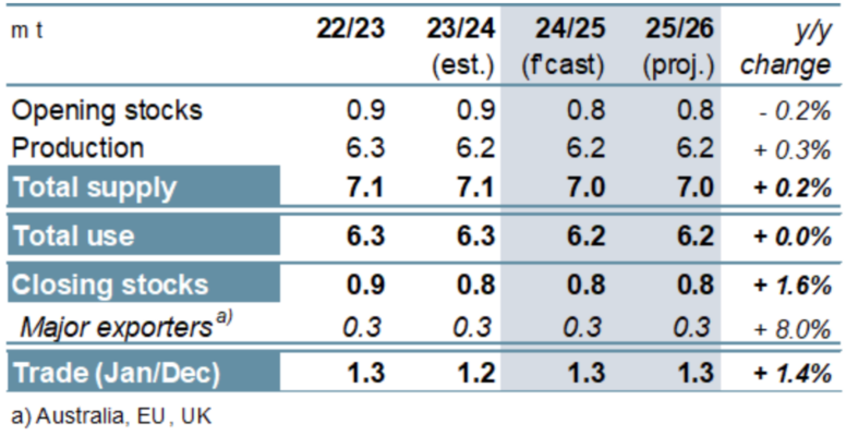 С учетом незначительных корректировок по пшенице и просу, мировое производство зерна (пшеницы и фуражного зерна) в 2024/25 гг. прогнозируется на 3 млн т ниже м/м (месяц к месяцу) и составит 2 303 млн т. Прогноз потребления снижен на 8 млн т, до 2 328 млн т, включая понижение оценки продовольственного использования пшеницы (в основном в Индии) и различные сокращения для кормов (в основном кукурузы).