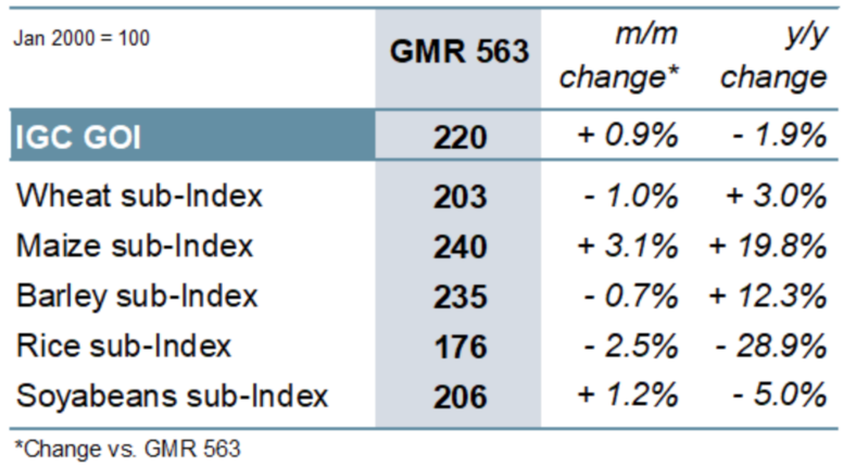 За последний месяц индекс IGC GOI вырос на 1%, поскольку рост средних экспортных цен на пропашные культуры с лихвой компенсировал снижение цен на рис, пшеницу и ячмень.