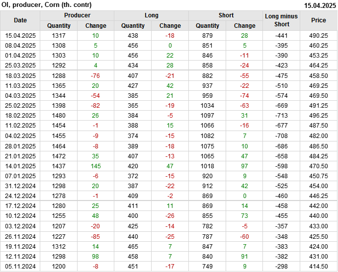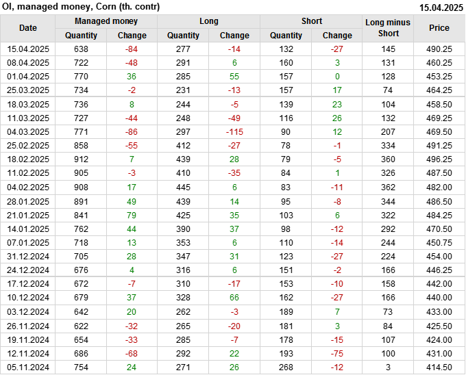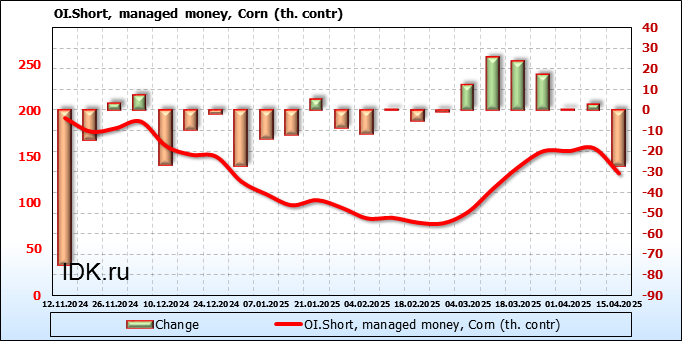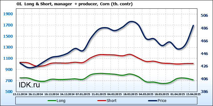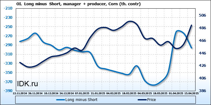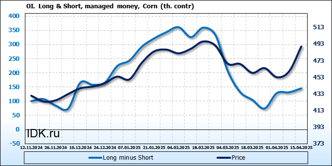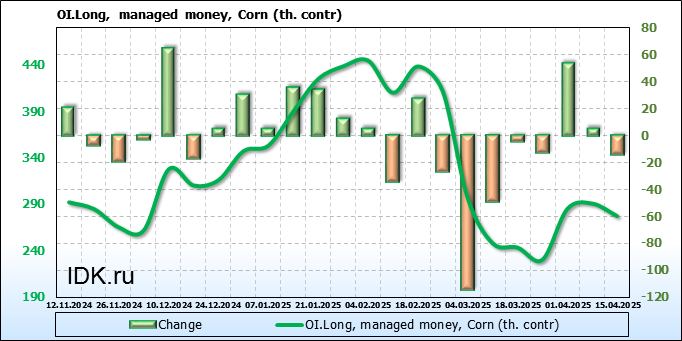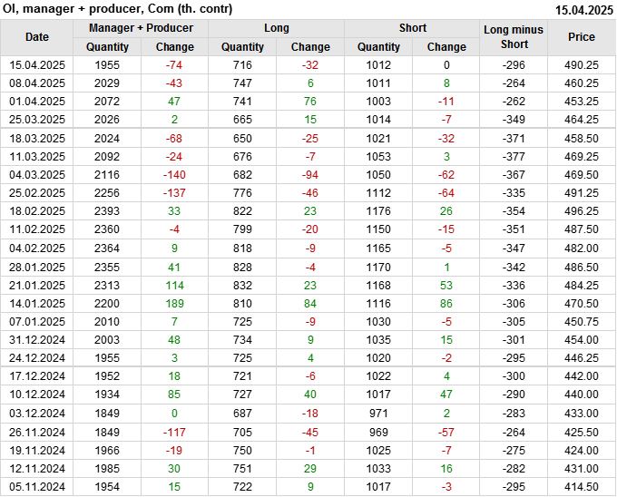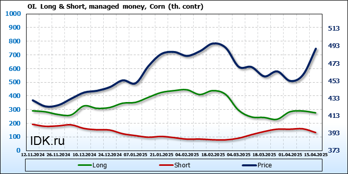 За прошлую неделю, 09.04.25 — 15.04.25, разница между длинными и короткими позициями управляющих увеличилась на 14 тыс. контрактов. В тоже время, цена выросла на 30 центов.