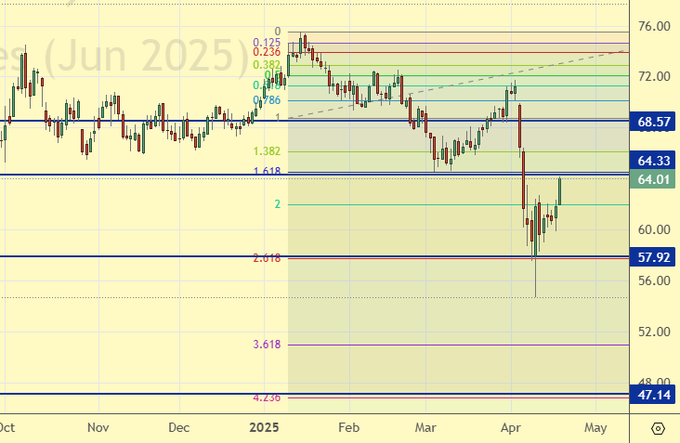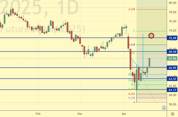 Нефть продолжила восстанавливаться на фоне объявления США о том, что пошлины на китайскую электронику вводиться не будут. А значит и остального не будет тоже, и вообще Трампу надо брать бюллетень и ложиться под капельницу. А раз так, то угрозы мировому порядку больше нет. Товарищ президент понервничал… и заработал с друзьями много денег на рукотворной панике.