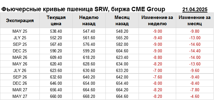 На 21.04.2025 стоимость пшеницы SRW на бирже CME Group по контракту MAY 25 составила 538.4 цента за бушель. За прошедшую неделю стоимость пшеницы SRW упала на 9 цента/бушель.