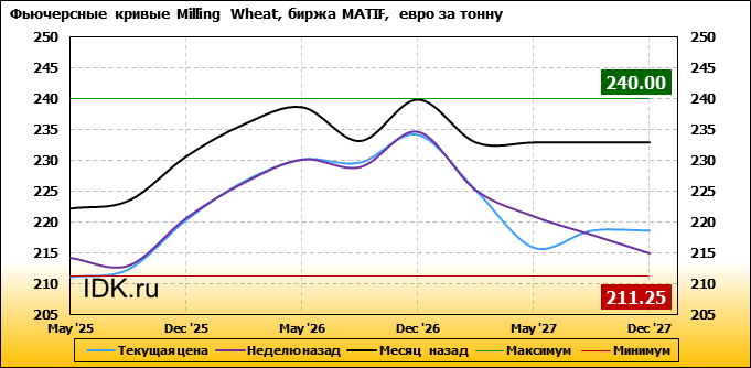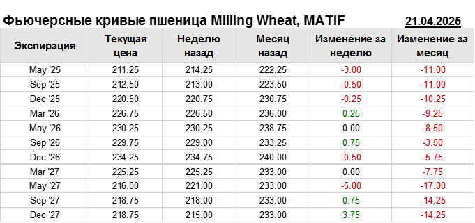 На 21.04.2025 стоимость пшеницы Milling Wheat на бирже MATIF по контракту May ’25 составила 211.25 евро за тонну. За прошедшую неделю стоимость пшеницы Milling Wheat упала на 3 евро/тонна. Как мы видим на графике, фьючерсная кривая имеет периоды, когда более дальний фьючерс дешевле ближнего. Состояние бэквардации наблюдаем на следующих контрактах: Sep ’26; Mar ’27; May ’27. Таким образом, трейдеры предполагают, что возможно превалирование предложения над спросом в указанные периоды.