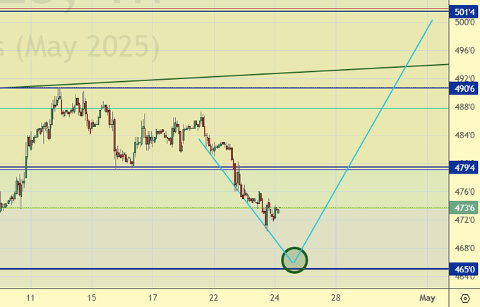 «Нужен, нужен нам откат по кукурузе к 465.0. Это мы писали позавчера. Предлагается прильнуть к экранам и с помощью гипноза заставить рынок пасть к данной отметке. Где и купим». Это вчерашняя рекомендация. Продолжаем гипнотизировать свечи.