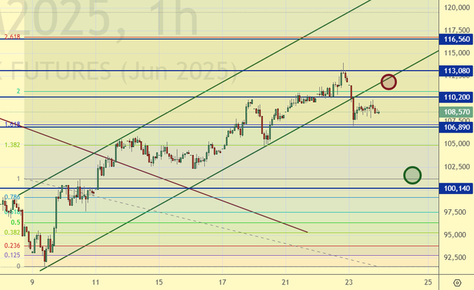 Ослабление рубля привело к пробою канала вниз, что может привести к быстрому движению к 100000. Рынок будет ждать завтрашнего решения по ставке. По поводу СВО: если Запад прекратит финансирование, а такие предпосылки появились, то вся эта история сдуется очень быстро.