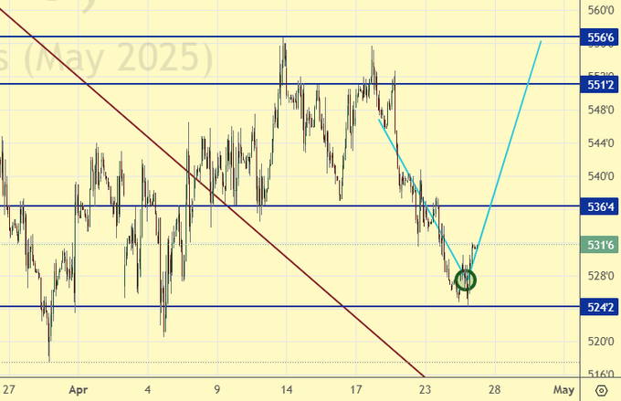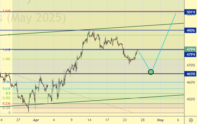 Не исключено, что при слишком позитивных видах на будущий урожай мы увидим в мае попытку пробиться к 450.0. А пока покупка на коррекции.