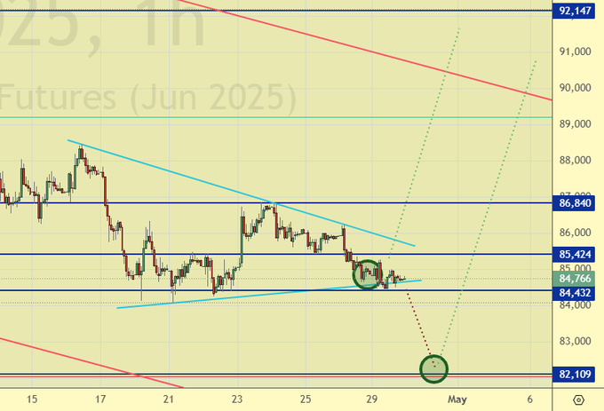Покупка: пока нет. Кто в позиции от 84874 и 86015, держите стоп на 84200. Цель: 115000.