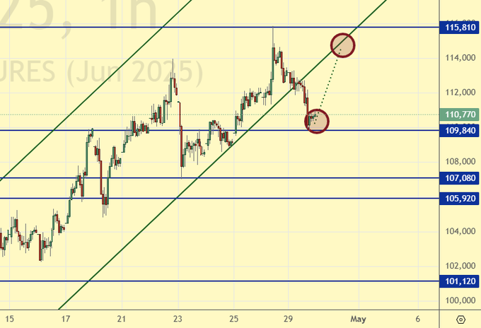 Макнули вниз. Не исключен возврат к 114000, которым обязательно надо воспользоваться для входа в шорт. Если будет ускорение падения с текущих уровней не торопитесь выходить из шорта.
