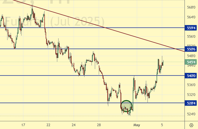 Пшеница (майский контракт, CME Group, исполнение 14.07.2025)