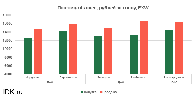 За прошедшую неделю с 28.04.2025 по 02.05.2025 средняя цена на пшеницу 4-го класса, согласно выставленным заявкам трейдеров, выросла по всем округам на 16 рублей. Средняя цена составляет 14687 рублей за тонну.