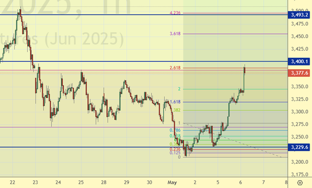 У нас 12-го мая центральный отчет WASDE за 2025-й год. Первый прогноз на новый сезон. Пока не видно беспокойства на рынке. Тут, надо подчеркнуть, что Чикаго будет учитывать вероятность собственного затоваривания из-за торговых войн. Китай точно не будет поддерживать экономику США в текущей ситуации. А значит, не видать американским фермерам контрактов на поставку в Азию.