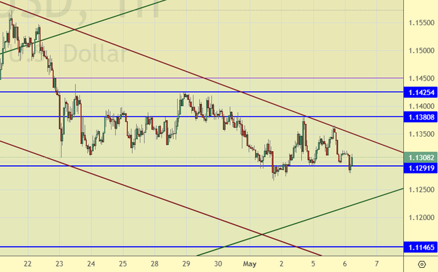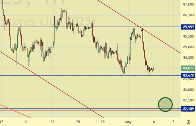 Нарисовали вверх импульс и выполнили цель по нему. Это может привести к тому, что мы продолжим уходить вверх. Нам придется отработать возможность дальнейшего роста после заседания ФРС 7-го мая. То есть завтра. Попробуем купить на откате.