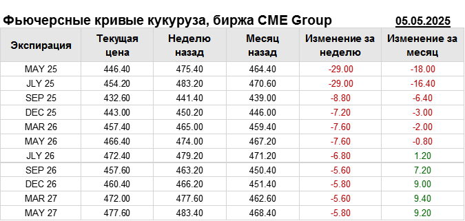 На 05.05.2025 стоимость кукурузы на бирже CME Group по контракту MAY 25 составила 446.4 цента за бушель. За прошедшую неделю стоимость кукурузы на площадке CME Group упала на 29 центов/бушель. Как мы видим на графике, фьючерсная кривая имеет периоды, когда более дальний фьючерс дешевле ближнего. Состояние бэквардации наблюдаем на следующих контрактах: SEP 25; SEP 26. Таким образом, трейдеры предполагают, что возможно превалирование предложения над спросом в указанные периоды.