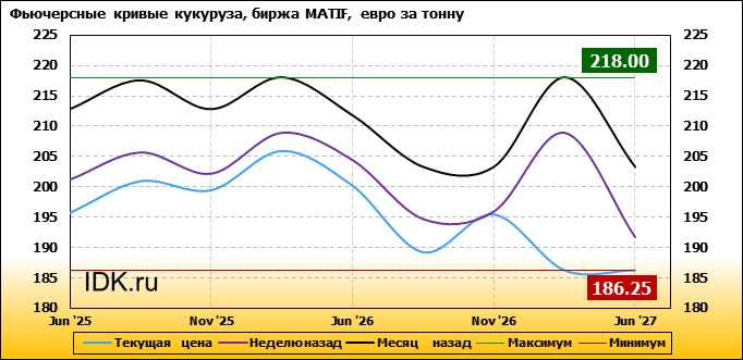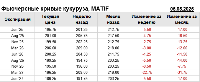 На 05.05.2025 стоимость кукурузы на бирже MATIF по контракту Jun ’25 составила 195.75 евро за тонну. За прошедшую неделю стоимость кукурузы на европейской площадке упала на 5.5 евро/тонна. Как мы видим на графике, фьючерсная кривая имеет периоды, когда более дальний фьючерс дешевле ближнего. Состояние бэквардации наблюдаем на следующих контрактах: Nov ’25; Jun ’26; Aug ’26; Mar ’27. Таким образом, трейдеры предполагают, что возможно превалирование предложения над спросом в указанные периоды.