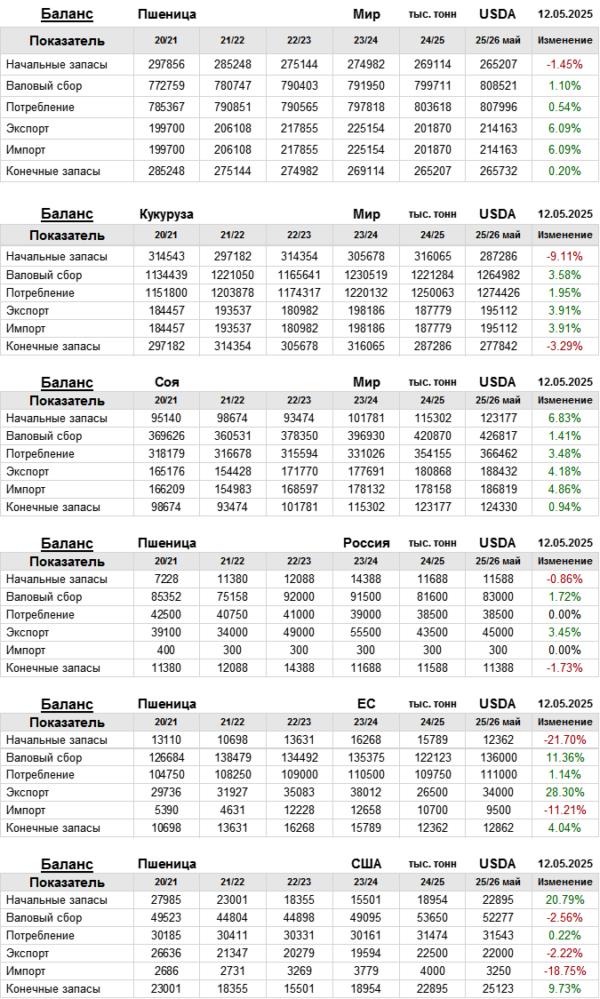 Валовый сбор: майская оценка сезона 25/26 составляет 426817 тысяч тонн. Потребление: оценивается в 366462 тысячи тонн. Экспорт: оценивается в 188432 тысячи тонн. Импорт: составит 186819 тысяч тонн. Конечные запасы: составят 124330 тысяч тонн.