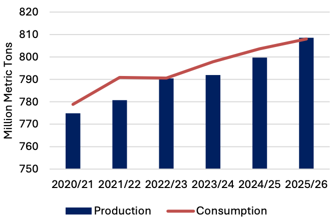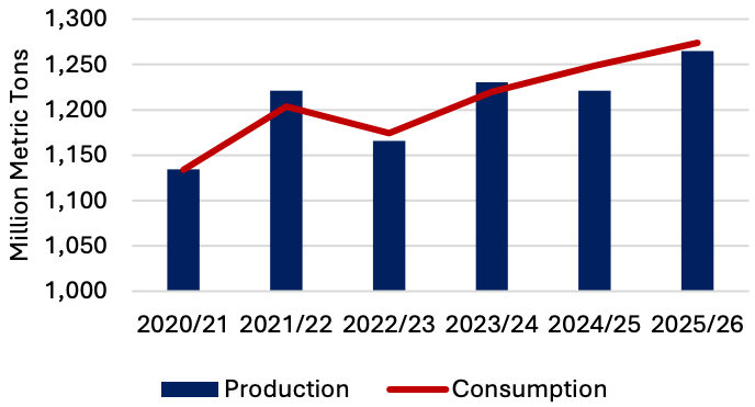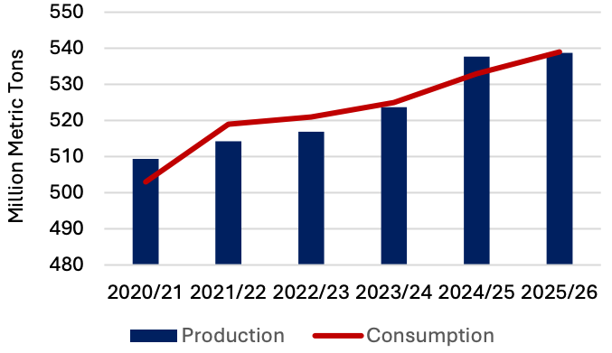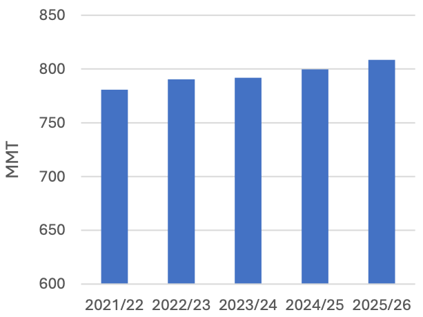 Мировое производство пшеницы в 2025/26 году прогнозируется на уровне 808,5 млн тонн, что на 8,8 млн тонн больше, чем в предыдущем году. Европейский союз увеличит производство на 13,9 млн тонн, восстанавливаясь после погодных условий предыдущего года, которые снизили урожайность и качество. Ожидается, что урожайность в России повысится, что приведет к увеличению урожая на 2 %. На Украине неблагоприятные погодные условия во время посевной и продолжающаяся война являются ключевыми факторами сокращения производства на 2 процента. Ожидается, что возвращение урожайности к тренду в Казахстане приведет к снижению производства.