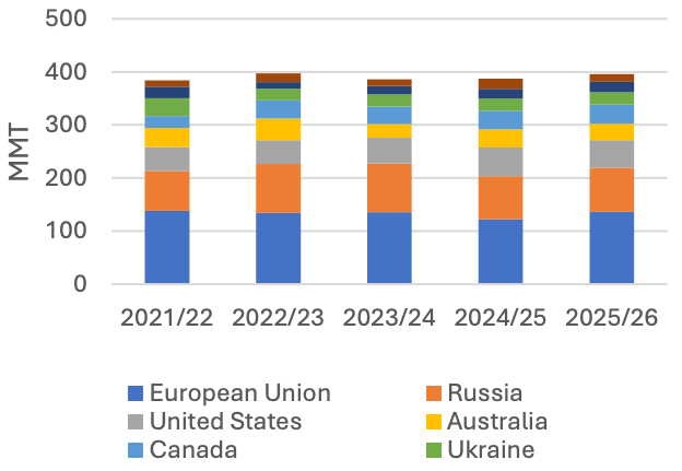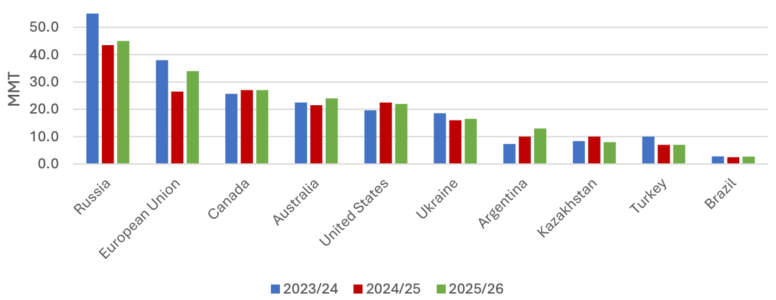 Ожидается, что в 2025/26 торговом году (июль/июнь) между Россией и Европейским союзом сохранится жесткая конкуренция, поскольку обе страны имеют более крупные урожаи. По прогнозам, Россия будет главным мировым экспортером уже шестой год подряд, при этом цены на пшеницу будут оставаться конкурентоспособными. Ожидается, что ЕС сохранит за собой позицию второго по величине экспортера пшеницы после того, как снижение производства в 2024/25 году помешало экспорту. Прогнозируется, что экспорт ЕС увеличится на 28 % по сравнению с предыдущим годом, при этом ожидаются значительные поставки в Африку. В то же время экспорт из Украины, по прогнозам, незначительно вырастет из-за небольшого роста поставок.