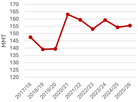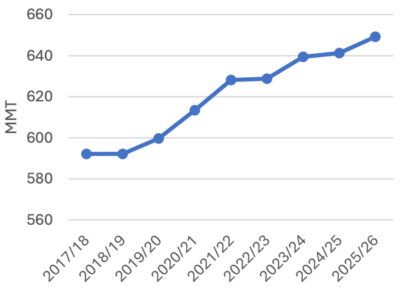 Потребление кормов и остатков пшеницы характеризуется большей годовой изменчивостью по сравнению с FSI, зависящей от относительных цен на кормовое зерно, качества урожая и общих поставок. Ожидается, что в 2025/26 году потребление кормов и остатков увеличится незначительно, при этом рост будет более значительным среди других зерновых. Атрибут «корма и остатки» также отражает потери или неучтенное использование (компонент «остатки») на различных этапах сбытовой цепочки.