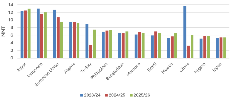 Египет останется главным мировым импортером в 2025/26 году (июль/июнь), прогнозируемый объем импорта составит 13,0 млн тонн. Египет продолжает реализовывать свою давнюю программу субсидирования хлеба, при этом значительная часть импорта приходится на частный сектор. Помимо пшеницы, перерабатываемой для внутреннего потребления, Египет, как ожидается, продолжит экспортировать часть пшеничной муки в соседние страны, такие как Судан. Напротив, импорт в Алжир и Марокко, как ожидается, сократится в связи с улучшением внутренних поставок.