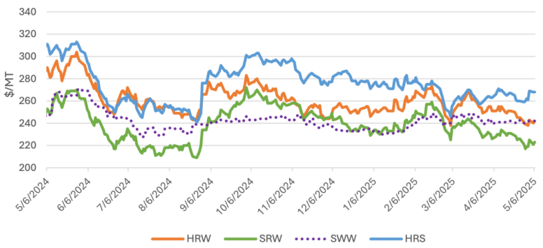 Внутренние цены: Динамика цен на пшеницу в США после апрельского WASDE была смешанной по классам. Цены на твердую красную озимую снизились на 9 долларов за тонну до 242 долларов, а на мягкую красную озимую — на 3 доллара за тонну до 223 долларов на фоне благоприятной погоды и положительной оценки из отчета NASS Crop Progress от 5 мая, в котором отмечается, что посевные площади озимой пшеницы в США оцениваются в 51 процент хороших/отличных, по сравнению с 48 процентами месяц назад и на 1 процент выше, чем в прошлом году. Цены на твердую красную яровую пшеницу подскочили на 5 долларов за тонну до 268 долларов при сокращении внутренних поставок, а мягкая белая озимая подорожала на 3 доллара за тонну до 242 долларов при высоком экспортном спросе.