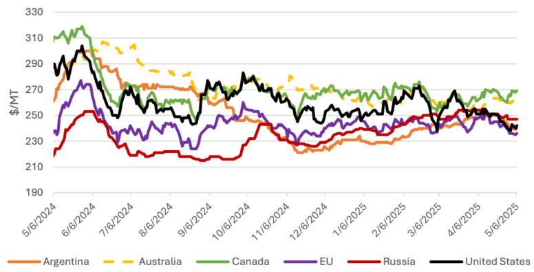 Прогнозируется рост экспорта из Аргентины за счет более высокого урожая, что усилит конкуренцию с Австралией, особенно в Юго-Восточной Азии. Экспорт из Канады прогнозируется на уровне предыдущего года, в то время как экспорт из США снизится на 500 000 тонн из-за снижения производства и сильной конкуренции на мировом рынке. Прогнозируется рост экспорта из Австралии в связи с ожидаемым высоким спросом на рынках Азии.