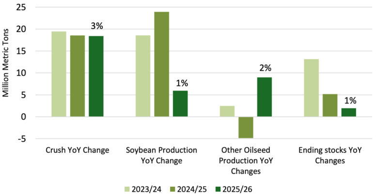 В 2025/26 году прогнозируется рост мирового производства масличных культур за счет увеличения производства соевых бобов в Бразилии, рапса в ЕС, Канаде и России, а также подсолнечника в ЕС и Украине. Соответственно, ожидается рост объемов дробления, торговли и конечных запасов. Рост объемов дробления обусловлен увеличением переработки соевых бобов в Китае, США, Аргентине и Бразилии. Украина и подсолнечник из ЕС также способствуют росту объемов дробления. Торговля масличными прогнозируется на фоне роста экспорта соевых бобов из Бразилии. Мировые запасы масличных немного увеличатся из-за роста мировых конечных запасов сои, арахиса, хлопкового семени и рапса. Ожидается, что Соединенные Штаты сократят конечные запасы сои.