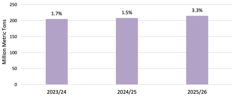 Мировое производство масличных культур в 2025/26 году прогнозируется на уровне рекордных 692 млн тонн, что на 2 % больше, чем в 2024/25 маркетинговом году. Рост производства обусловлен увеличением объемов производства сои в Южной Америке, но темпы роста будут ниже, чем в последние годы. После прошлогодней засухи, которая привела к снижению урожайности в Европе, ожидается значительное восстановление производства рапса и подсолнечника. Мировое производство сои, по прогнозам, вырастет почти на 6 миллионов тонн до 427 миллионов благодаря более крупному урожаю в Бразилии, несмотря на снижение урожая сои в США, Канаде и Аргентине.