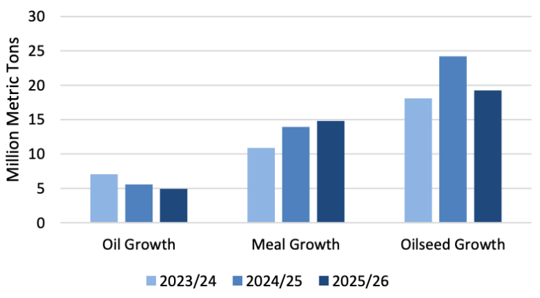 Мировая торговля масличными культурами вырастет на 3 %, почти полностью за счет экспорта сои, который компенсирует снижение экспорта рапса. Рекордный экспорт соевых бобов из Бразилии контрастирует с несколько более низким экспортом из США из-за меньшего урожая и увеличения внутреннего использования. Рост импорта возглавляют Китай, Аргентина, Египет, Пакистан и Бангладеш. Прогнозируется, что торговля рапсом снизится почти на 4 % из-за сокращения импорта из ЕС на фоне восстановления внутреннего производства.
