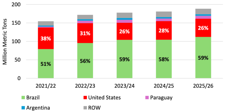 В 2025/26 году прогнозируется рост мирового производства соевого масла до нового рекордного уровня, однако ожидается, что экспорт снизится по сравнению с предыдущим годом. Ожидается, что рост производства в Бразилии и США будет направлен на внутреннее потребление. В связи с ростом производства в основных странах-импортерах соевых бобов ожидается, что запасы соевого масла в 2025/26 году немного вырастут, несмотря на сокращение объемов торговли маслом.