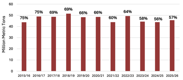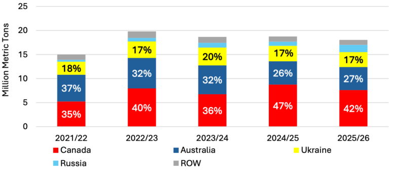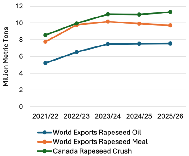 Несмотря на рекордные объемы дробления, рост торговли рапсовым шротом в 2025/26 годах не ожидается. Ожидается, что в 2025/26 гг. импорт рапсового шрота в Китай продолжит сокращаться, поскольку он ищет менее дорогостоящие альтернативы канадскому рапсу. Экспорт рапсового масла также не изменится по сравнению с прошлым годом, и в 2025/26 году Канада будет поставлять меньше. Ожидается, что производство рапсового шрота и масла в Канаде будет расти, но меньшими темпами. Несмотря на объявленный рост мощностей по дроблению рапса в Канаде, ожидается, что снижение экспорта рапсового шрота в Китай и неопределенность в отношении политики США в области биотоплива будут сдерживать его использование.