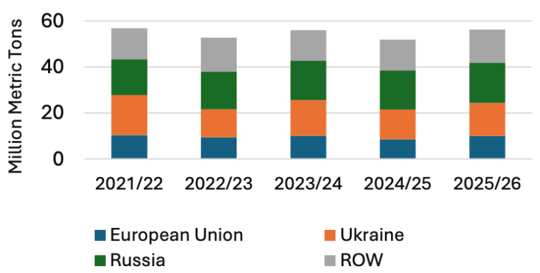 Восстановление дробления подсолнечника позволит увеличить производство продуктов из подсолнечника с трехлетних минимумов, достигнутых в 2024/25 годах. Значительное увеличение импорта подсолнечного масла ожидается в Китае и Индии, в основном для пищевых нужд. Ожидается, что Китай также увеличит импорт подсолнечного шрота в связи с поиском альтернативы рапсовому шроту.