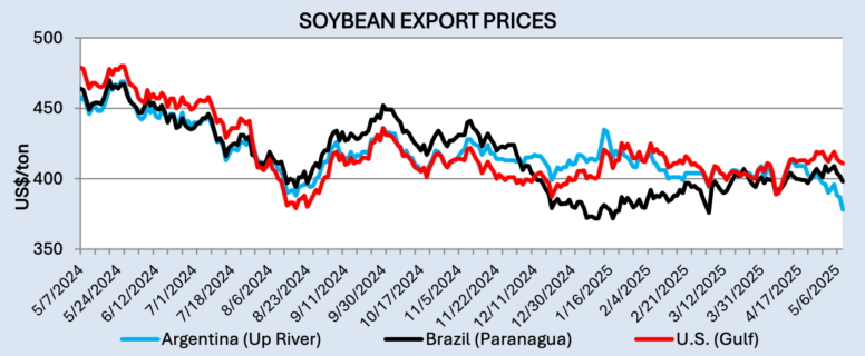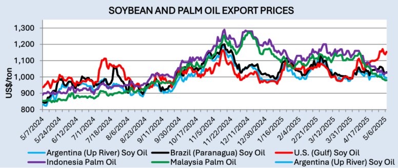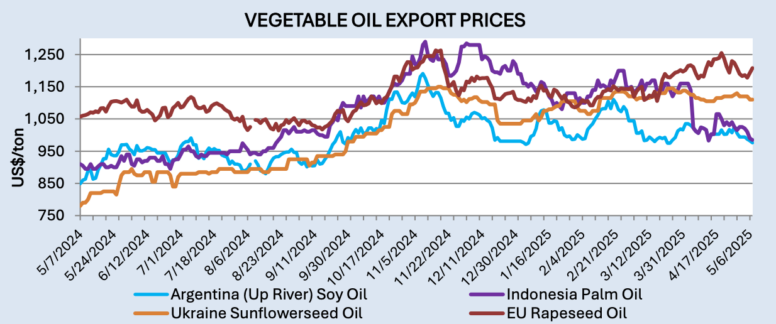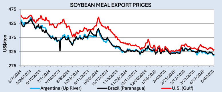 Цены на соевые бобы восстановились после кратковременного падения в начале апреля в ответ на объявления о введении тарифов. Цены на соевые бобы в Бразилии и США остаются относительно неизменными, в то время как цены на соевые бобы в Аргентине снизились с середины апреля на фоне девальвации аргентинского песо. Цены на соевый шрот в целом следовали за соевыми бобами и оставались достаточно постоянными. Аргентинский соевый шрот остается наиболее конкурентоспособным по цене.