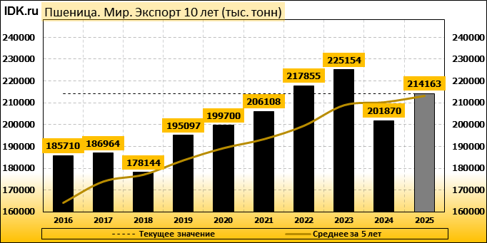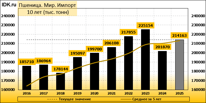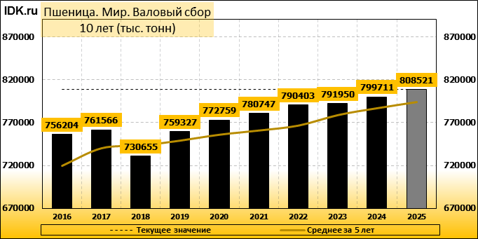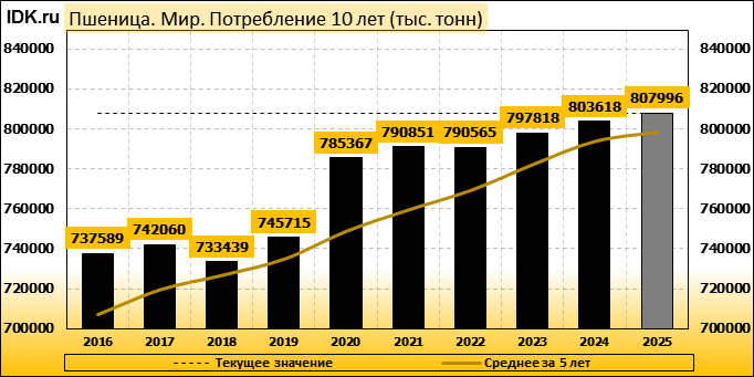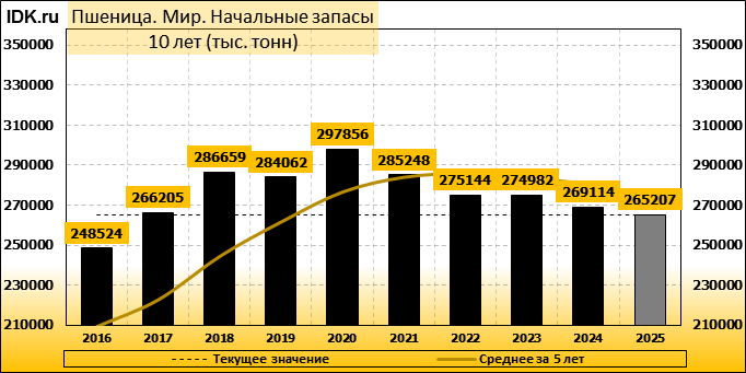 Валовый сбор: майская оценка сезона 25/26 составляет 808521 тысячу тонн. Потребление: оценивается в 807996 тысяч тонн. Экспорт: оценивается в 214163 тысячи тонн. Импорт: составит 214163 тысячи тонн. Конечные запасы: составят 265732 тысячи тонн.