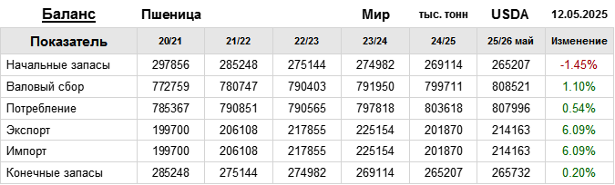 За прошедший месяц министерство сельского хозяйства США (USDA) на 12.05.2025 пересмотрело Баланс пшеницы для Мира в сезоне 25/26 следующим образом: