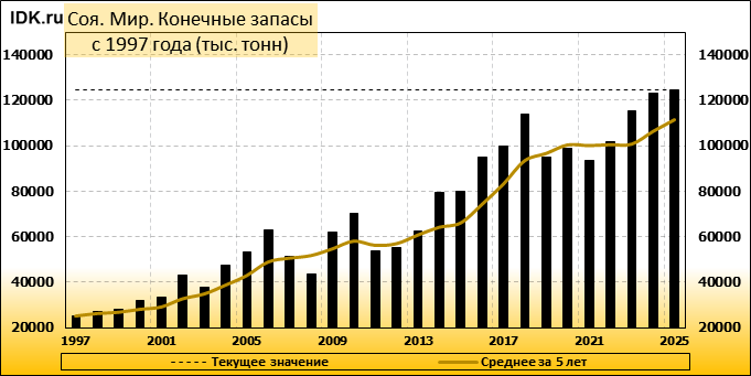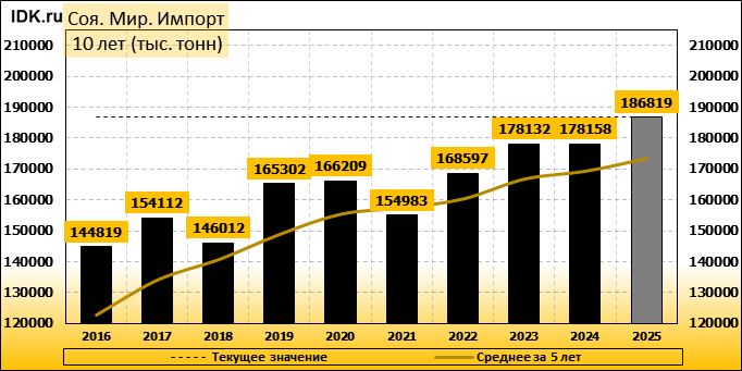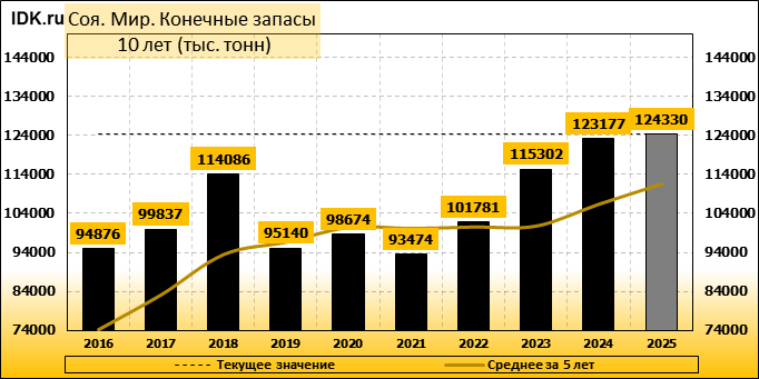 Валовый сбор: майская оценка сезона 25/26 составляет 426817 тысяч тонн. Потребление: оценивается в 366462 тысячи тонн. Экспорт: оценивается в 188432 тысячи тонн. Импорт: составит 186819 тысяч тонн. Конечные запасы: составят 124330 тысяч тонн.
