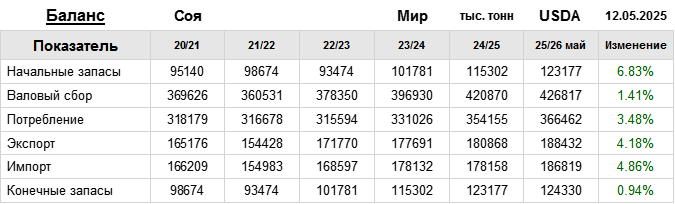 За прошедший месяц министерство сельского хозяйства США (USDA) на 12.05.2025 пересмотрело Баланс сои для Мира в сезоне 25/26 следующим образом: