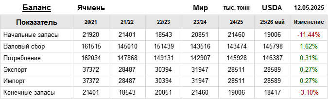 За прошедший месяц министерство сельского хозяйства США (USDA) на 12.05.2025 пересмотрело Баланс ячменя для Мира в сезоне 25/26 следующим образом: