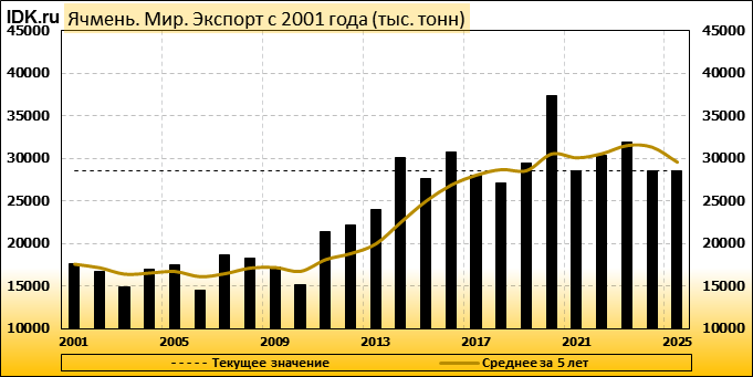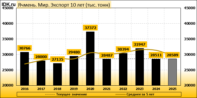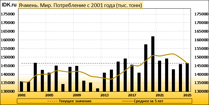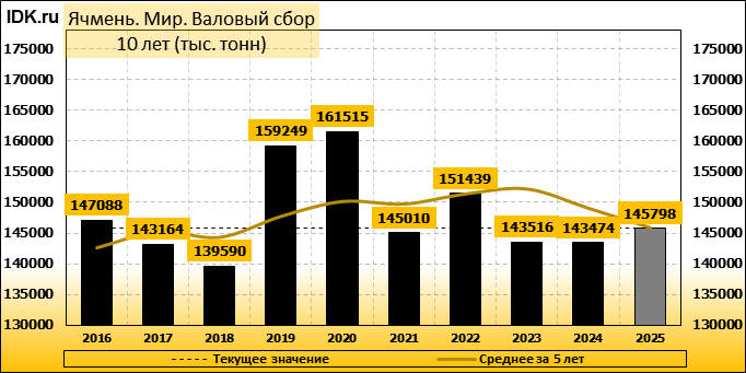 Валовый сбор: майская оценка сезона 25/26 составляет 145798 тысяч тонн. Потребление: оценивается в 146387 тысяч тонн. Экспорт: оценивается в 28589 тысяч тонн. Импорт: составит 28589 тысяч тонн. Конечные запасы: составят 18417 тысяч тонн.