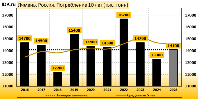 За прошедший месяц министерство сельского хозяйства США (USDA) на 12.05.2025 пересмотрело Баланс ячменя для России в сезоне 25/26 следующим образом: