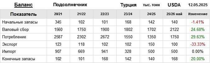 За прошедший месяц министерство сельского хозяйства США (USDA) на 12.05.2025 пересмотрело Баланс подсолнечника для Турции в сезоне 25/26 следующим образом: