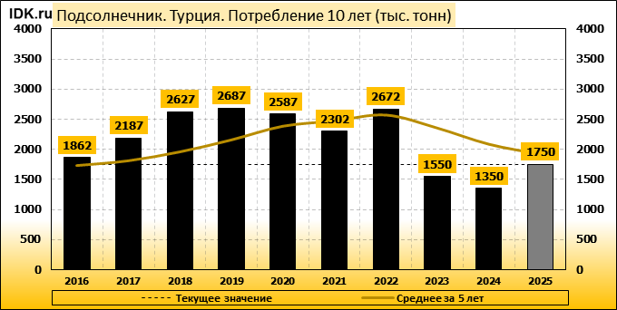 По прогнозам, производство масличных культур в Турции в 2025-26 маркетинговом году снизится по сравнению с предыдущим годом из-за динамики рынка и сокращения посевных площадей, говорится в отчете Министерства сельского хозяйства США (USDA). Общее производство масличных культур, включая соевые бобы, семена подсолнечника и хлопчатника, по прогнозам, сократится на 17% по сравнению с 2024-25 годом и составит почти 3 млн тонн. Производство подсолнечника в 2024-25 г. прогнозируется на уровне 1,6 млн тонн, что на 300 000 меньше; производство сои незначительно снизится до 140 000 тонн со 145 000 тонн, а хлопка — до 1,25 млн тонн с 1,6 млн тонн.